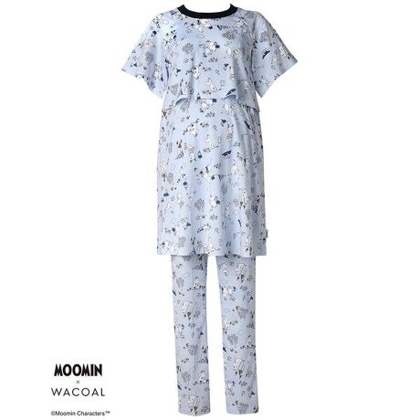 【マタニティ用パジャマ(産前・産後兼用)】トップス袖丈:半袖(3分袖)・ボトム脇丈:長ズボン(10分丈)・かぶりタイプ・授乳あき付き【MOOMIN×WACOAL】●好奇心旺盛なムーミン一家と仲間たちが描かれたマタニティ用パジャマが登場●自然あふれる森の中でムーミンや仲間たちが集まる、愛らしくやさしいプリント柄●マタニティの体型変化を考慮したリラックスシーンにぴったりのパターン設計で、産前も産後も快適に着用できる●ボトムはマタニティ用の設計でおなかをすっぽり包みこみ、ウエストも高伸度ゴムの使用でラクなはきごこち(ウエストゴム取り替え口あり)●伸びやかで、シーズンを通して着られるパジャマの定番素材である綿100%スムース素材を本体に使用。60番手の細い糸で編まれる生地は、肌ざわりがなめらかで上品な風合い(60綿スムース素材)●ボトムにポケットあり【サイズ詳細】マタニティM-L:着丈77.0cm 裄丈38.0cm ボトム脇丈99.5cm 裾まわり38.0cm 股下(レングス)68.0cm ウエスト66.0cm ヒップ104.0cm※出来上がり寸法を表示しております※サイズ詳細の寸法には多少の差異がございます%