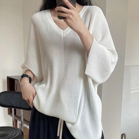 深めのVネックはデコルテラインを美しく見せて、上品さをプラス。<br>