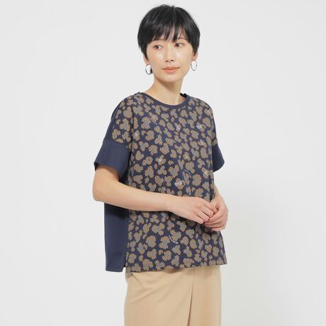 パンサー柄を斜めのスラッシュを入れてプリントし、強すぎない印象に仕上げたプリントカットソー。所々に入れたグリッターで華やかさを加えました。1枚でも決まる、インナーとしても活躍する総柄アイテムです。特に、同じ展開のソフトシアーカットソー(U5P16547/U7P16547)を重ね着するコーディネートがおすすめです。
