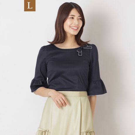 襟、袖口、リボンコサージュに配色のピコ刺しゅうをあしらった、袖切替えデザインがポイントのカットソーです。