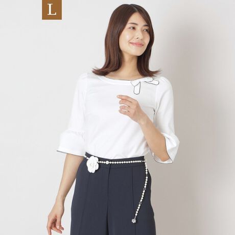 襟、袖口、リボンコサージュに配色のピコ刺しゅうをあしらった、袖切替えデザインがポイントのカットソーです。