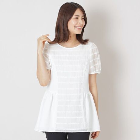 中心パネルはウエスト切替を入れないすっきりとしたデザインで、脇パネルには切替とギャザーを施し、腰まわりにふんわりとしたシルエットを持たせています。さらに、後ろをバックテールにすることで、ヒップラインを自然にカバーするデザインに仕上げました。