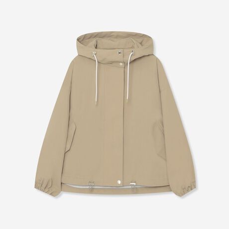 ドロップショルダーのミリタリーフーデッドジャケット「SKYE PARKA SHORT」。Aラインのフォルムとパフスリーブが印象的な一着です。裾のドローストリングでシルエットのアレンジを楽しめます。表地に透湿防水の素材を使用し、機能性とデザイン性を兼ね備えた一着です。