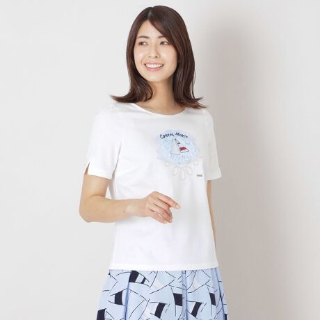 スリット入りの五分袖に、セイル(ヨット)柄のモチーフをあしらったカットソーです。