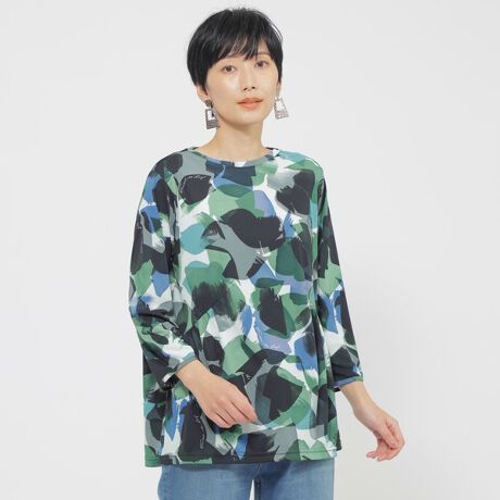 前身頃の脇と袖下にシャーリングギャザーの入った総柄カットソー。プリントは筆でペイントしたようなタッチで、重なったところがアニマルに見えたり、葉の中にアニマルがいるかのように見えるオリジナルの柄です。シャーリングがはいる事で 立体感と動きが加わり、1枚でも存在感のあるアイテムです。