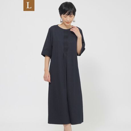 [型番:U7J05545__]【L】【ウォッシャブル】サッカーストレッチタックワンピースこちらはラージサイズです。前身頃に折り紙タックを施したワンピースです。二の腕をカバーする袖丈で安心感のあるデザインで、1枚で決まる便利なアイテムです。【素材】独特の表面感のあるポリエステルサッカー素材です。非常に軽量でストレッチ性もあるため快適な着心地です。(春夏展開商材)