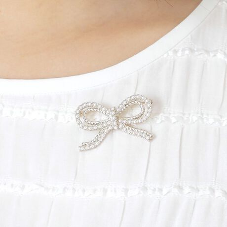 ロープのようなラインでリボンを表現したミニブローチです。シルバー(90)のクリスタルガラをあしらったタイプと、ゴールド(94)のパール調パーツをあしらった2色展開。取り入れやすいリボンデザインのブローチは、シンプルトップスを華やかにみせてくれます。