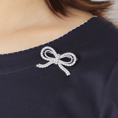 ロープのようなラインでリボンを表現したミニブローチです。シルバー(90)のクリスタルガラをあしらったタイプと、ゴールド(94)のパール調パーツをあしらった2色展開。取り入れやすいリボンデザインのブローチは、シンプルトップスを華やかにみせてくれます。