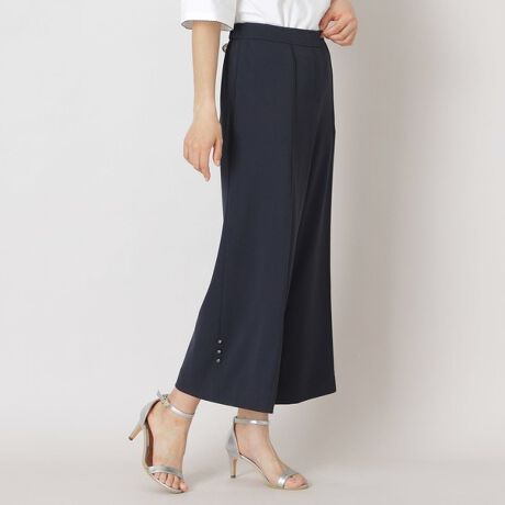 センターにつまみピンタックを施すことで、縦長効果を演出。腰まわりがすっきりと見える、きれいめシルエットのワイドパンツです。裾のサイドにはラインストーンのビジューパーツをあしらい、さりげない華やかさをプラスしています。