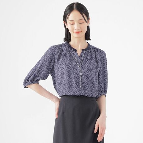 キーネックで襟ぐりにぬけ感のあるブラウスです。インナーとしても、1枚着としても、羽織としても着用でき、高い汎用性が特徴です。