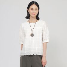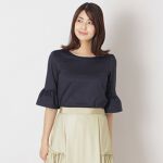襟、袖口、リボンコサージュに配色のピコ刺しゅうをあしらった、袖切替えデザインがポイントのカットソーです。