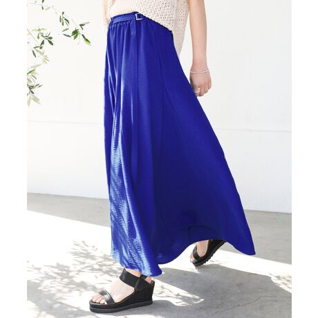 マチでフレアをつくり、どの角度から見ても足さばきがよく見えるスカンツ。腰回りはすっきり見せて、裾に行くほどきれいに広がるフレアで足長効果。サイドベルトディテールがアクセントです。しわになりにくいので、これからのお出かけシーンに大活躍します。