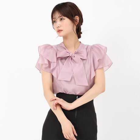 ボウタイが顔周りを華やかに演出し、フリル袖が女性らしいやわらかさをプラスします。