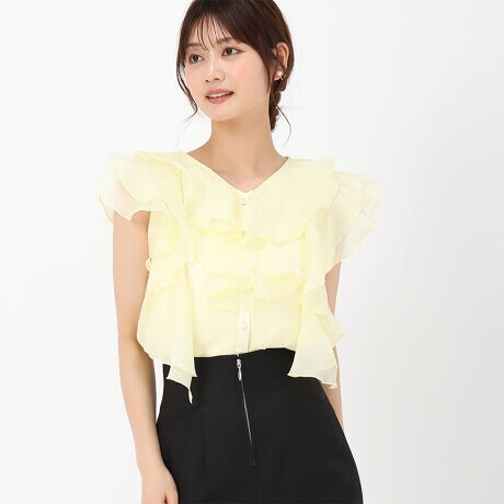 ひらりとしたフリルが華やかなムードを演出するブラウス。透け感のあるシアー素材を使用し、やわらかい印象を与えます。フロントのパール調ボタンがポイント。シンプルなボトムスと合わせたバランスの良い着こなしがおすすめです。■fabric透け感[有り]裏地[無し]伸縮性[無し]生地の厚さ[薄手]