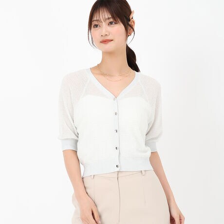 透け感のあるシアーラメツイード生地が上品な印象を与えるカーディガン。ふんわりとしたパフスリーブになっており、可愛らしさを演出します。デコルテを美しく見せるVネックがポイント。季節の変わり目のお出かけシーンに重宝したいアイテムです。■fabric透け感[有り]裏地[無し]伸縮性[有り]生地の厚さ[薄手]
