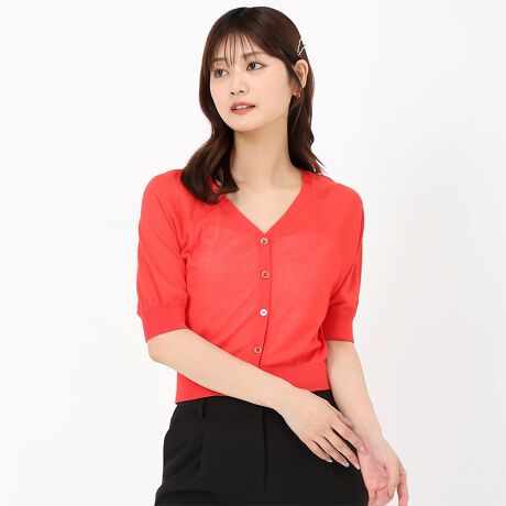 ふんわり丸みのあるパフスリーブが、女性らしいやさしい雰囲気を演出するシアーカーディガン。