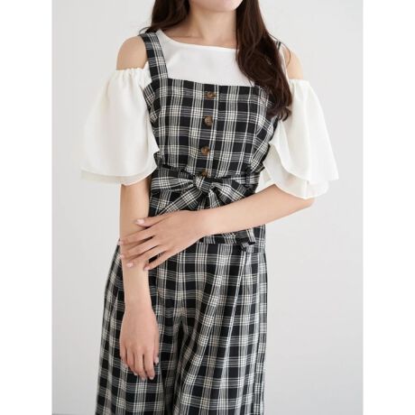 ・シアー素材を重ねた2重フリルのスリーブが華やかさを演出するトップス。