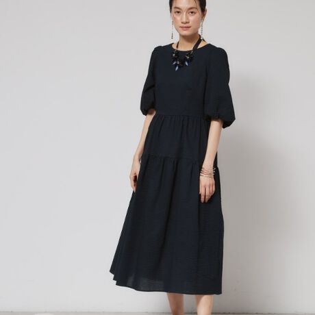大胆なボリュームスリーブがポイントのティアードワンピース。