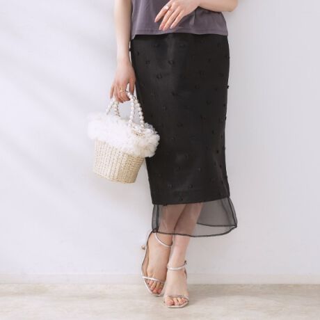 トレンドのシア―感のある素材を使ったデザインIラインスカート。