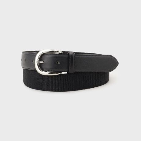 このベルトは、前面にはレザーを使用し、ドレスベルトとしての洗練された印象を持ちながら、後側は同色の平ゴム素材を採用。