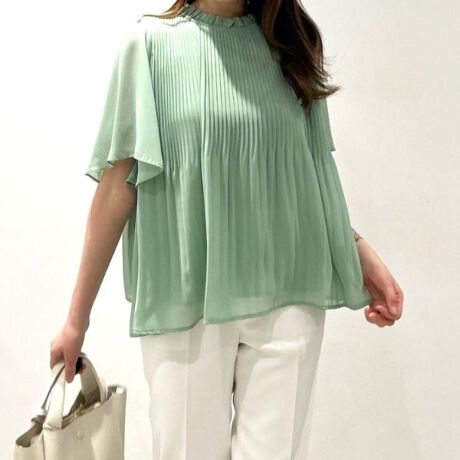 衿元のフリルがフェミニンなプリーツブラウス。