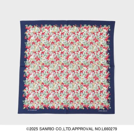 全面のイチゴ柄の中にマイメロディが見え隠れするデザインのプリントハンカチです。