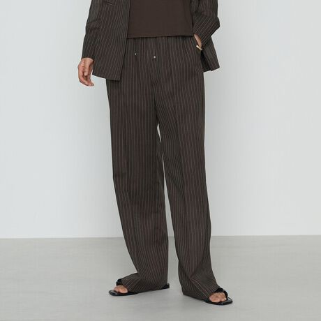 ストライプのシャープな柄とリラックス感のあるウエストゴム&ドロストの着用感が程良い、夏に向けてぴったりのイージーパンツです。