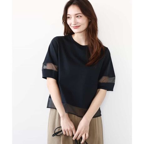 袖と裾のシアーな切り替えデザインがトレンド感のあるカットソーです。丈は短めなのでインしなくてもすっきり着やすく、袖は長めの半袖なので二の腕カバーもでき、一枚で着用しやすいです。汗ばむ季節に嬉しい接触冷感機能付きです。