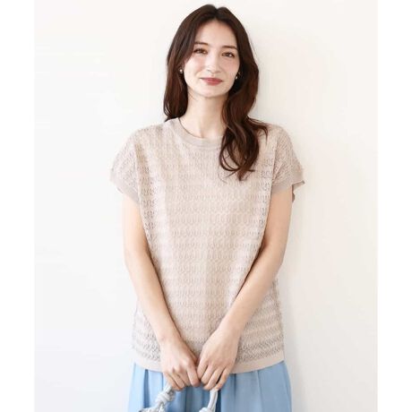 透かし編みのニットプルオーバーは、大人可愛い印象を与え、前釦タイプで開けて着用するスタイルも可能。シンプルなタン