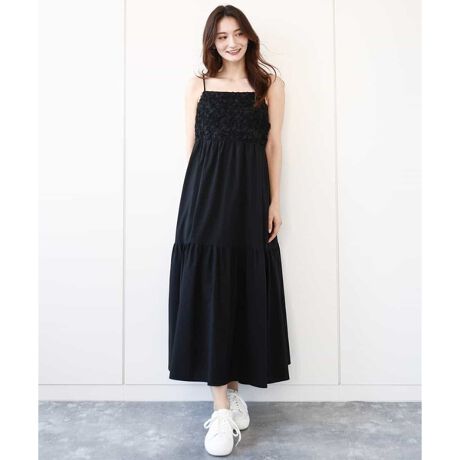 胸元の3D刺繍デザインが今年らしいキャミワンピース。刺繍生地を部分的にすることで、大人女子にも着こなしやすく仕上げました。スカート部分もやや低めにティアード切り替えにすることで女性らしく、すっきりとしたシルエットに。ポケット付きも嬉しいポイントです。