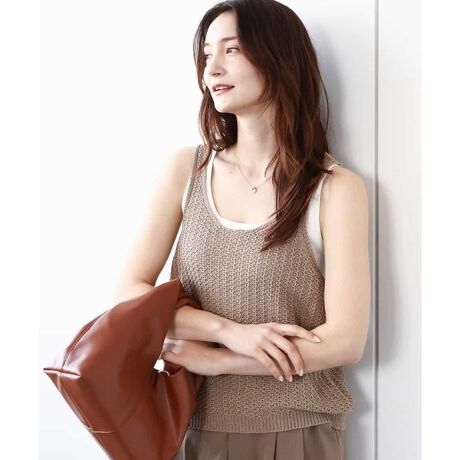 夏に映えるレイヤードアイテムとしておすすめの、編み地が可愛いニットタンクトップです。素材感はドライタッチな清涼感ある手触りで、厚手すぎない中肉素材。コンパクトに見えますが、伸縮性があるので窮屈感なく着られました。裾はリブデザインですが、絞りすぎないシルエットなのもおなかが目立たずうれしいポイントです◎。