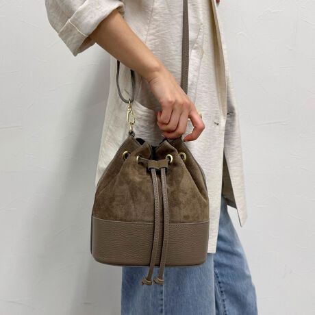 ・スエードとレザーの組み合わせが上品な巾着バッグです