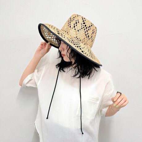 ・深めのフォルムがカジュアルになりがちな麦わら帽子に洗練された印象をプラス