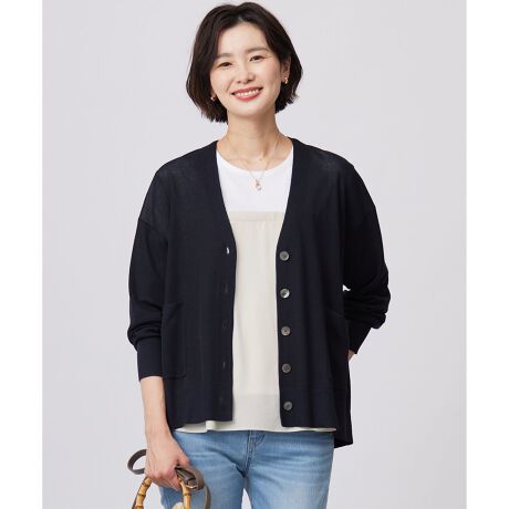 ■デザインさっと羽織るだけできれいに決まるVネックカーディガン。アームホールにゆとりを持たせつつ、編み続きの襟ラインで大人っぽい印象に仕立てました。インナーを選ばず、冷房対策にも重宝します。レイヤードスタイルや肩掛けアクセントにも大活躍。繊細で光沢のある素材が上品な大人を演出するニットカーディガンです。