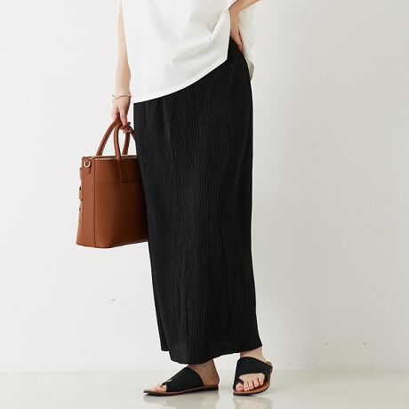 プリーツの効果ですっきりタイトにも見えつつ、細すぎないゆとりがあるのでスッキリめのトップス合わせから、オーバーサイズ合わせまで幅広いスタイリングを楽しめます。
