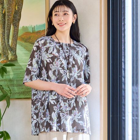 【洗える・日本製】トロピカルリーフ柄カットソー