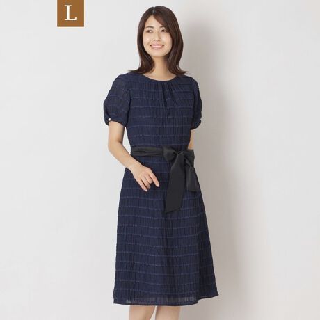 ジャカード織りでピンタックを表現したフィット&フレアラインのエレガントなワンピースです。横段のジャカード柄を活かし、中心パーツのウエストにはあえて切替を入れないデザインに仕上げています。別布のリボン付きで、お好みに合わせてウエストを絞ることも可能です。