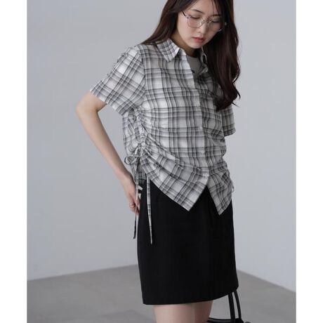 〔fabric&design〕コットン100%の水洗いした無地カラー(#030ホワイト/#050ブラウン)と、チェック柄(#021グレーチェック/#111ブルーチェック)のアソート展開のコンパクトシャツ。セットインの肩幅と身体に沿うシルエットで、両脇のドロスト加減で着丈の調整ができます。ドロスト加減を強くするとフロントボタンが開くように設定しています。コーデしていただくボトムスから肌見せやインナー見せしたり、ハイウエストベルトを覗かせることができ、スタイルアップ効果があります。また、チェック柄はフラットな面ではなくラインに凸凹がありニュアンス感がかわいいです。〔styling〕ワイドデニムやルーズシルエットパンツとのコーディネートがおススメです。ナロースカートやAラインミニスカートなどすっきりした印象のスカートとも◎