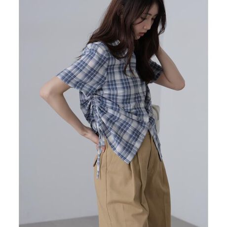 〔fabric&design〕コットン100%の水洗いした無地カラー(#030ホワイト/#050ブラウン)と、チェック柄(#021グレーチェック/#111ブルーチェック)のアソート展開のコンパクトシャツ。セットインの肩幅と身体に沿うシルエットで、両脇のドロスト加減で着丈の調整ができます。ドロスト加減を強くするとフロントボタンが開くように設定しています。コーデしていただくボトムスから肌見せやインナー見せしたり、ハイウエストベルトを覗かせることができ、スタイルアップ効果があります。また、チェック柄はフラットな面ではなくラインに凸凹がありニュアンス感がかわいいです。〔styling〕ワイドデニムやルーズシルエットパンツとのコーディネートがおススメです。ナロースカートやAラインミニスカートなどすっきりした印象のスカートとも◎