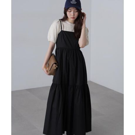 [fabric&Design] 昨年好評頂いた、コットンティアードキャミソールが今年も登場!一昨年と同じデザインに戻しています。新鮮で今年のロマンティックなトレンドにぴったりのレースとキャメルブラウンベースの小ギンガムチェック柄と使いやすい無地黒のアソート展開!ふんわりと揺れるティアードシルエットがレディライクなキャミワンピ。華奢なストラップと深めのネックデザインが女性らしい印象をプラス。 無地は洗いざらしのような厚手コットンタイプライターを使用し、程よいハリ感でティアードの広がりがきれいにでます。チェック柄は少しだけ落ち感がでる生地感。裏地付きで透け感が気になりません。[Styling]甘めのキャミワンピのインにロックTやスポーツT合わせで外しのあるカジュアルな着こなしがおすすめ。
