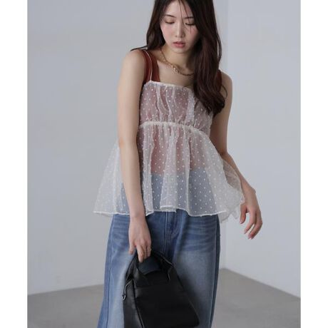 [型番:1315110043]ドットジャガードのオーガンジーの下にチュールを重ねた、エアリーな雰囲気のビスチェ。上身頃にはギャザーを加えて奥行きのある表情に仕上げています。華奢なサテンコードのストラップは、後ろのリボンで長さ調節が可能。カットソーやニット、シャツとのレイヤードでスタイリングの幅が広がり、シーズンレスで着ていただけます。※モデルの着用画像の場合、光の当たり具合により、実際の色味と異なって見えることがございます。色味は、商品単体の画像をご参照ください。