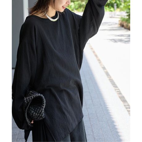 クルーネックでもヘンリーネックでも着ていただける前後2WAY仕様になっていて、着こなしに変化をつけられます。ゆるっとしたサイズ感がカジュアルですが、デコルテが美しく見えるような襟ぐりや、ストンと長めの袖のシルエットは今っぽいデザインで、合わせるアイテムによっては女性らしくモードな印象でも着ていただけます。スラックスやリブパンツなどと合わせて少しきれいめに、こなれ感を出して着ていただくのがおすすめです。
