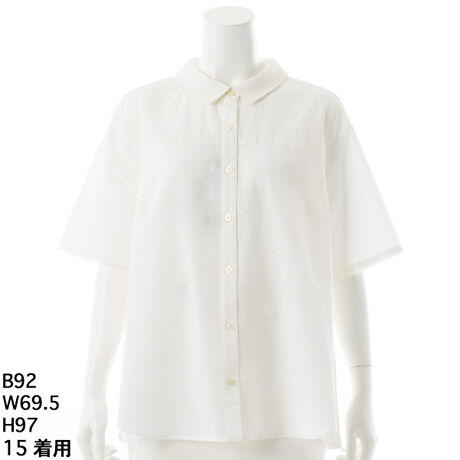 シンプルなレギュラーカラーシャツのシルエットを少し肩を小さく裾に向かって広がるAラインにすることで女性らしい仕上がりです。