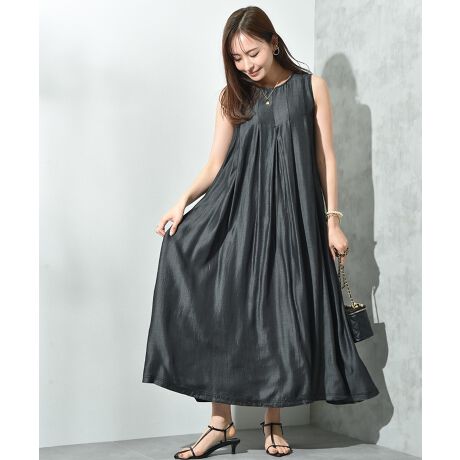上品な光沢感が目を惹き、落ち感のある涼し気な素材を使用しています。裾にかけて程よく広がるフレアシルエットがスタイルアップ効果抜群!動くたびに揺れるフレアーが大人レディなアクセントに。コンパクト目のラウンドネックは顔回りをすっきり見せてくれ、カジュアルな素材感ながら女性らしい印象に演出してくれるお勧めなワンピースです。