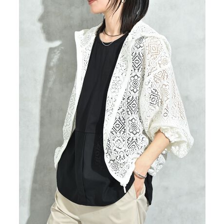 さらりとしたシアー感のあるレース素材で仕立てたブルゾンです。夏らしく爽やかに過ごしていただける羽織はワードローブに欲しい1枚。裾と袖口にゴムを使用し、そのギャザーから生まれる丸みのある女性らしい曲線のシルエットが◎
