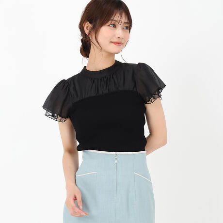 ビスチェ風のデザインが女性らしさを際立たせるニット。ひらりと舞うフレアスリーブになっており、華やかな印象を与えます。バックに施されたカットアウトがポイント。タイトスカートと合わせたレディライクなコーディネートがおすすめです。■fabric透け感[やや有り]裏地[一部有り]伸縮性[有り]生地の厚さ[普通]