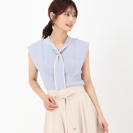 首元のタイがエレガントな雰囲気を放つニット。フレアスリーブのデザインは、ひらりとした動きを演出します。リングを外して結び方のアレンジを楽しめるのもポイント。ボトムスにタックインしたメリハリのある着こなしがおすすめです。■fabric透け感[やや有り]裏地[無し]伸縮性[有り]生地の厚さ[薄手]