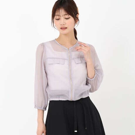 透け感のあるシアー素材がシーズンムードを演出するブルゾン。スリーブはふんわりとボリュームがあり、やわらかい印象を与えます。フロントZIP仕様で簡単に着脱できるのもポイント。お手持ちのカットソーやキャミソールとレイヤードした着こなしがおすすめです。■fabric透け感[有り]裏地[無し]伸縮性[やや有り]生地の厚さ[薄手]