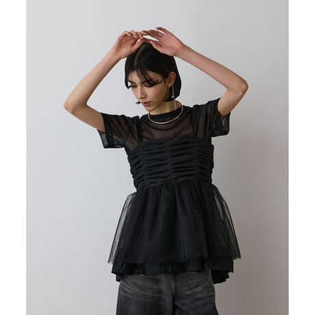 春夏らしい軽やかなニュアンススタイルを楽しめる着映えキャミソール。胸部分はタフタ素材に細かなプリーツテクニックを施し、そこからチュール素材を切り替えた柔らかなシルエットが魅力の一枚です。コンパクトな胸元とふわっと華やかに広がるシルエットを高めの位置で切り替えた事によって、女性らしい華奢さがありつつもメリハリの効いたシルエットを表現しました。華奢な肩紐やシアーな透け感や重なりから生まれる奥行きのあるイノセントな雰囲気が、大人の上品な甘さを惹きたてます。そのまま1枚で着るのはもちろんの事、タンクトップやシアートップスを中に添えたりと、様々な着回しをぜひお楽しみください。
