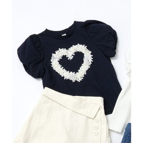 apres les cours(アプレレクール)の半袖Tシャツ「ハートモチーフバルーンスリーブTシャツ」は、ナチュラルなスタイルにさりげなくデザインをプラスしたおしゃれアイテム*